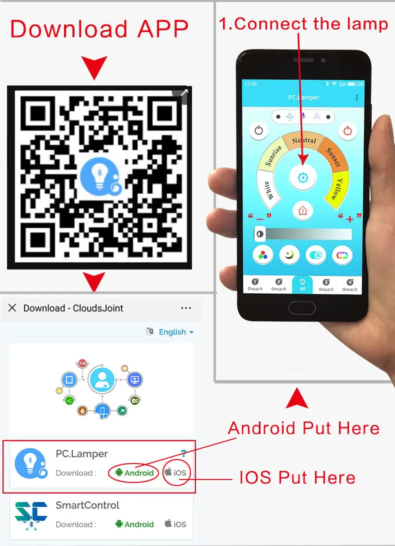 1.Phone APP with Control:yellow white,cool white,natural light,Sunrise,and Sunest, and aslo brightness or dark